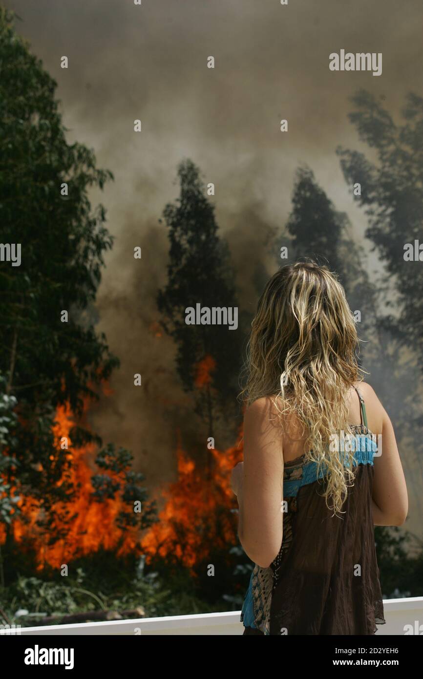 A Woman Looks At A Forest Fire In The Outskirts Of Penafiel City In Northern Portugal August 7 2005 Drought Stricken Portugal Is Deploying Troops To Support Weary Fire Crews Battling 22 Forest
